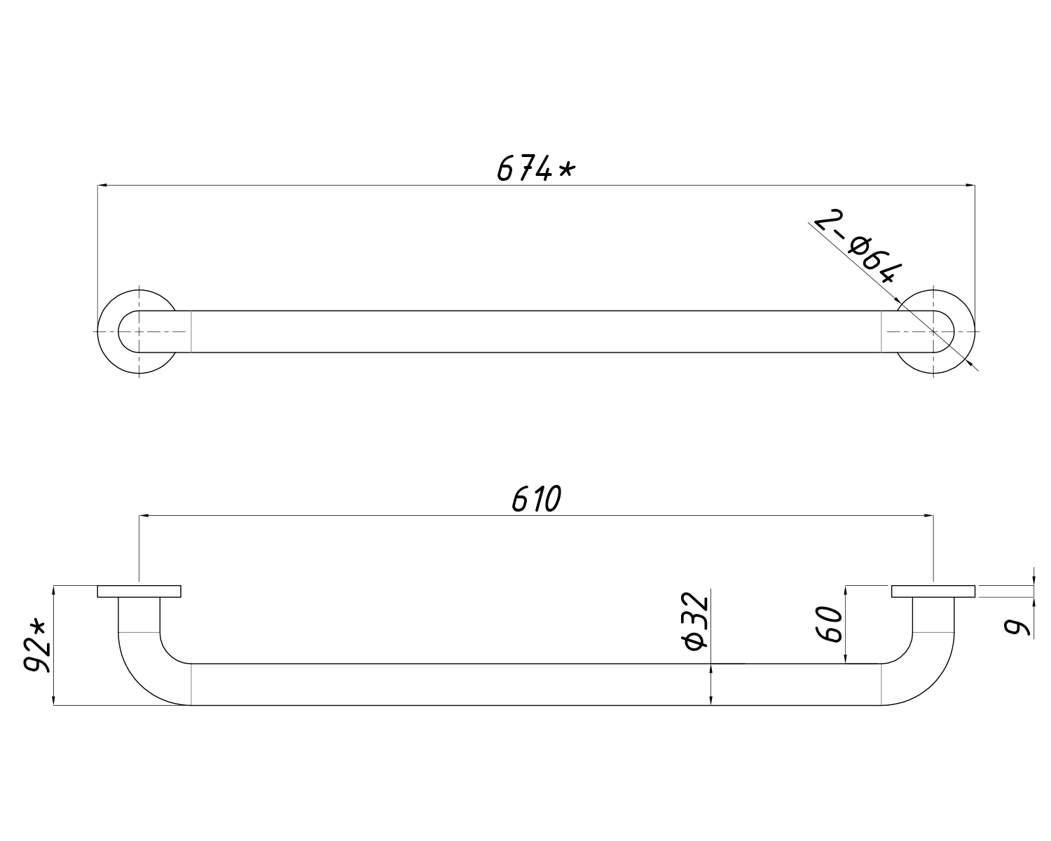 Опис 01-GBH Ручка для душу ⌀ 32мм, міжось 610
