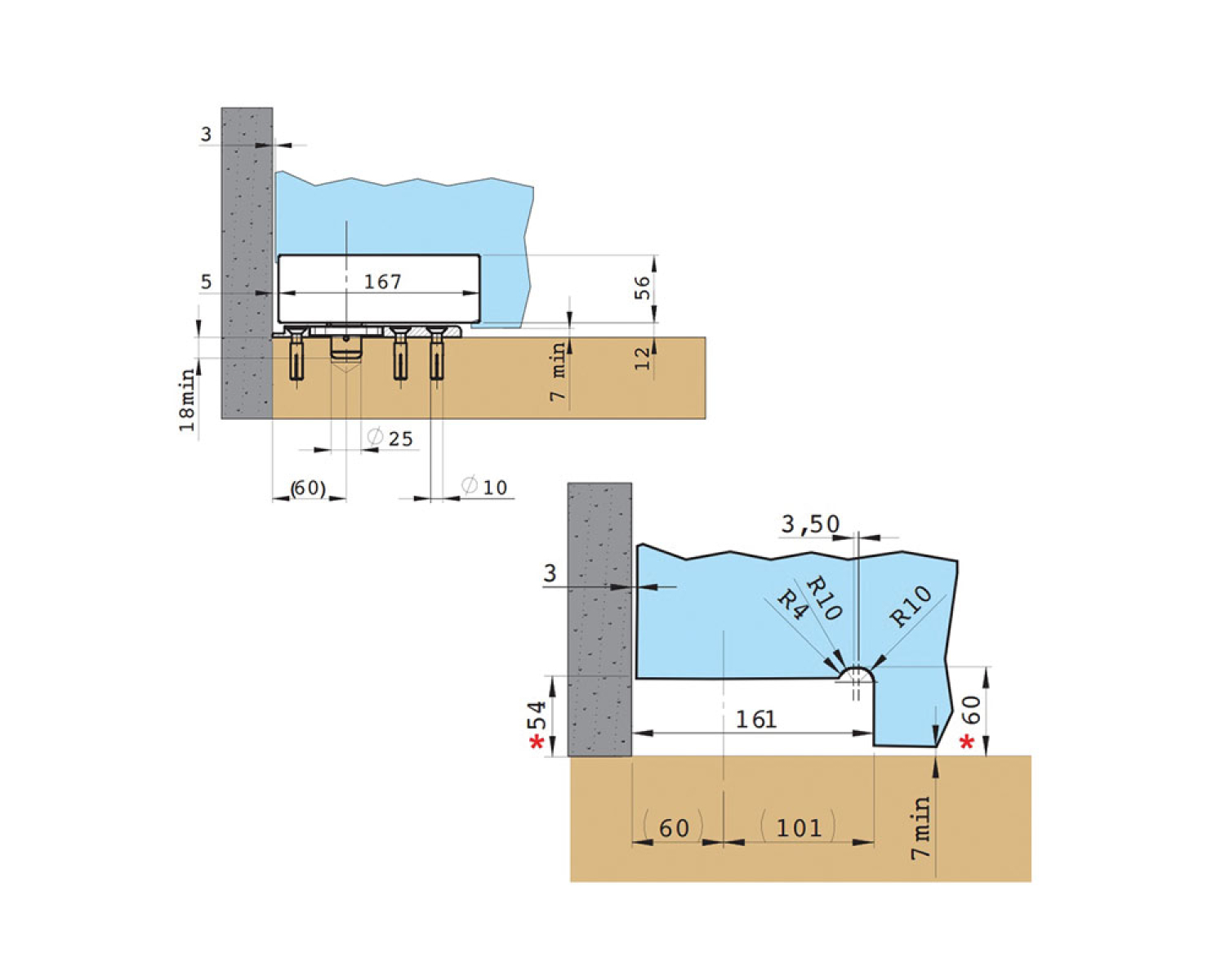 У випадку з петлею 100Е10 кріплення петлі до підлоги здійснюється всього трьома дюбелями, що значно спрощує та прискорює монтаж маятникової скляної перегородки.