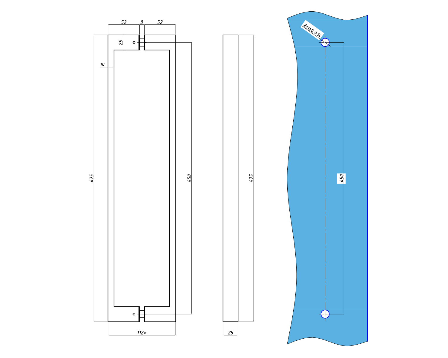 Монтаж ручки не потребує спеціального обладнання: вона кріпиться з обох сторін скла, забезпечуючи міцну фіксацію та естетичний зовнішній вигляд. Конструкція розрахована на стандартне скло товщиною 8–10 мм, що робить ручку універсальним рішенням для більшості душових перегородок.