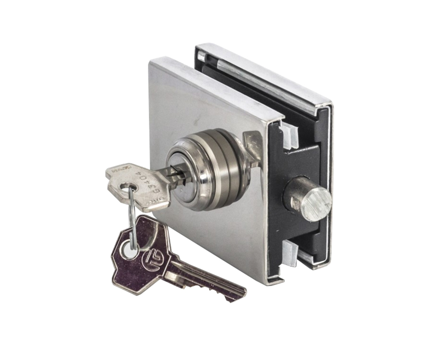 Замок з невеликими габаритними розмірами та ключем з одного боку для скляних маятникових конструкцій з товщиною скла від 8 до 12 мм.