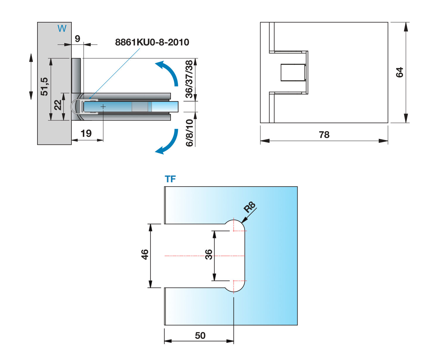 *Основною конструктивною особливістю даної петлі для скла є те, що вона може встановлюватись як з ущільнювачем до стіни, так й без (зверніть увагу що при цьому будуть різні вирізи в склі). Примітка: Петля даного виду має механізм самозакриття дверей на останніх сантиметрах без можливості регулювання положення закритих дверей, тому дуже важливо при встановленні дотримуватися рівня вертикальної стіни. Притвор дверей здійснюється за допомогою профілів ущільнювачів.