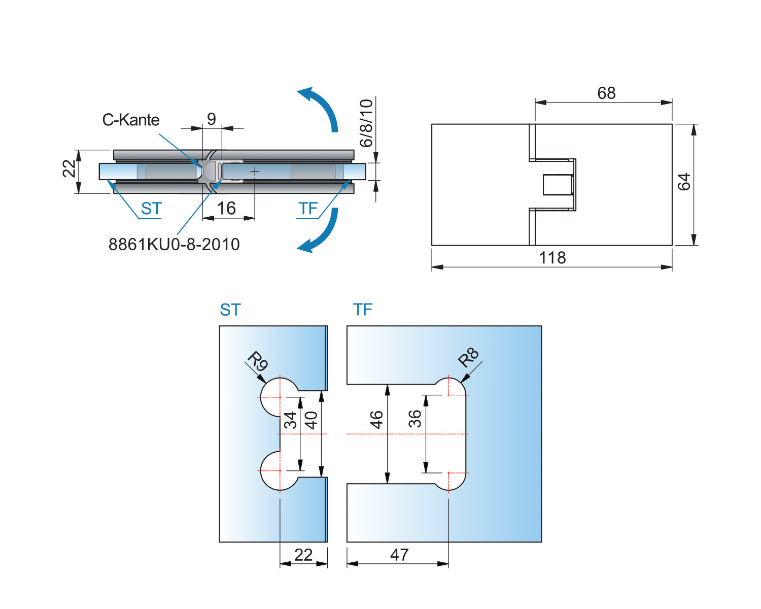 *Основною конструктивною особливістю даної петлі для скла є те, що вона може встановлюватись як з ущільнювачем до стіни, так й без (зверніть увагу що при цьому будуть різні вирізи в склі). Примітка: Петля даного виду має механізм самозакриття дверей на останніх сантиметрах без можливості регулювання положення закритих дверей, тому дуже важливо при встановленні дотримуватися рівня вертикальної стіни. Притвор дверей здійснюється за допомогою профілів ущільнювачів.