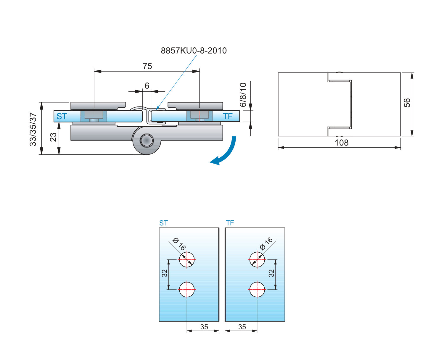 * Максимальна вага для двох петель: 36 кг, це відповідає розмірам скла товщиною 8 мм.