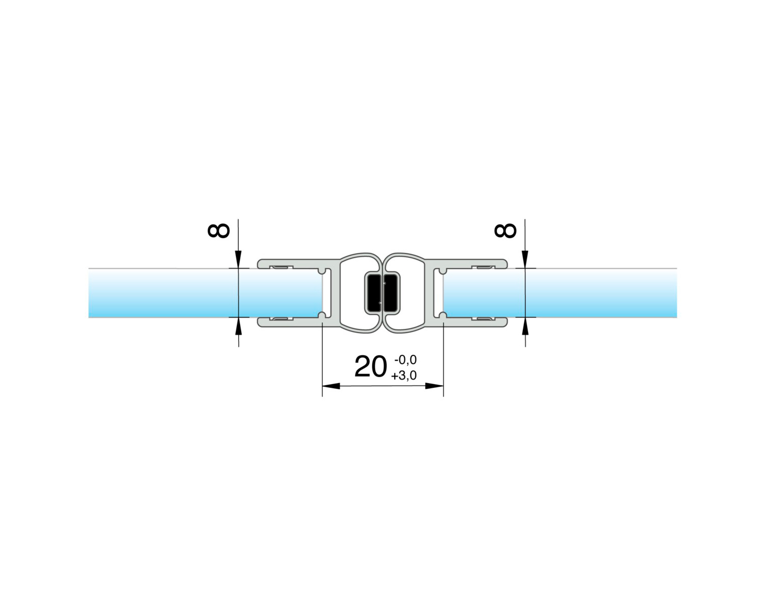 Ущільнювач виготовлений із прозорого пластику, який не впливає на естетику скляної конструкції та зберігає візуальну легкість душового простору. Вбудовані магніти забезпечують надійне з’єднання під кутом 180°, що робить його ідеальним для систем, де обидві дверні стулки розміщені на одній лінії та змикаються між собою.