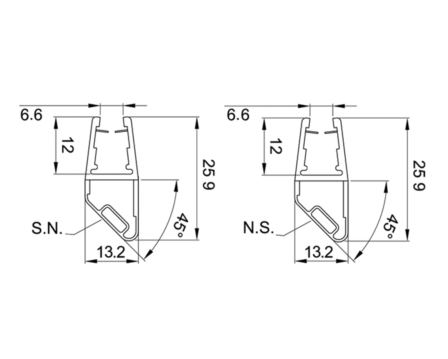 Душовий ущільнювач, що розроблений спеціально для запобігання протікань між двома панелями скла, які розташовуються під кутом від 90 до 180 градусів одна від одної.