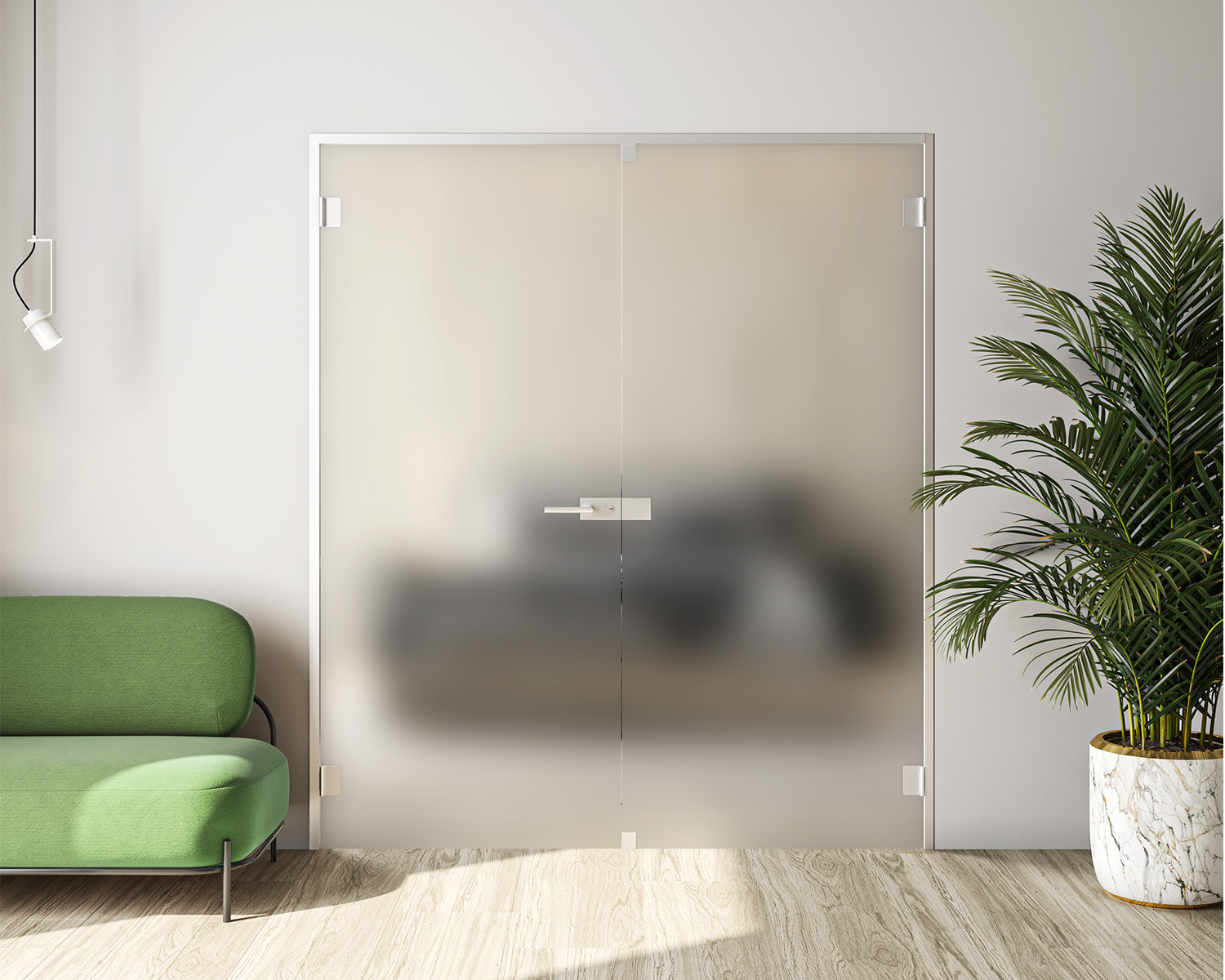 Унікальне та дуже ефективне рішення — використовувати двостулкові скляні двері в коробці. У даній моделі скляних дверей постійно працює тільки одна створка. Щоб відкрити одночасно обидві створки необхідно відкрити засувки на другій стулці.