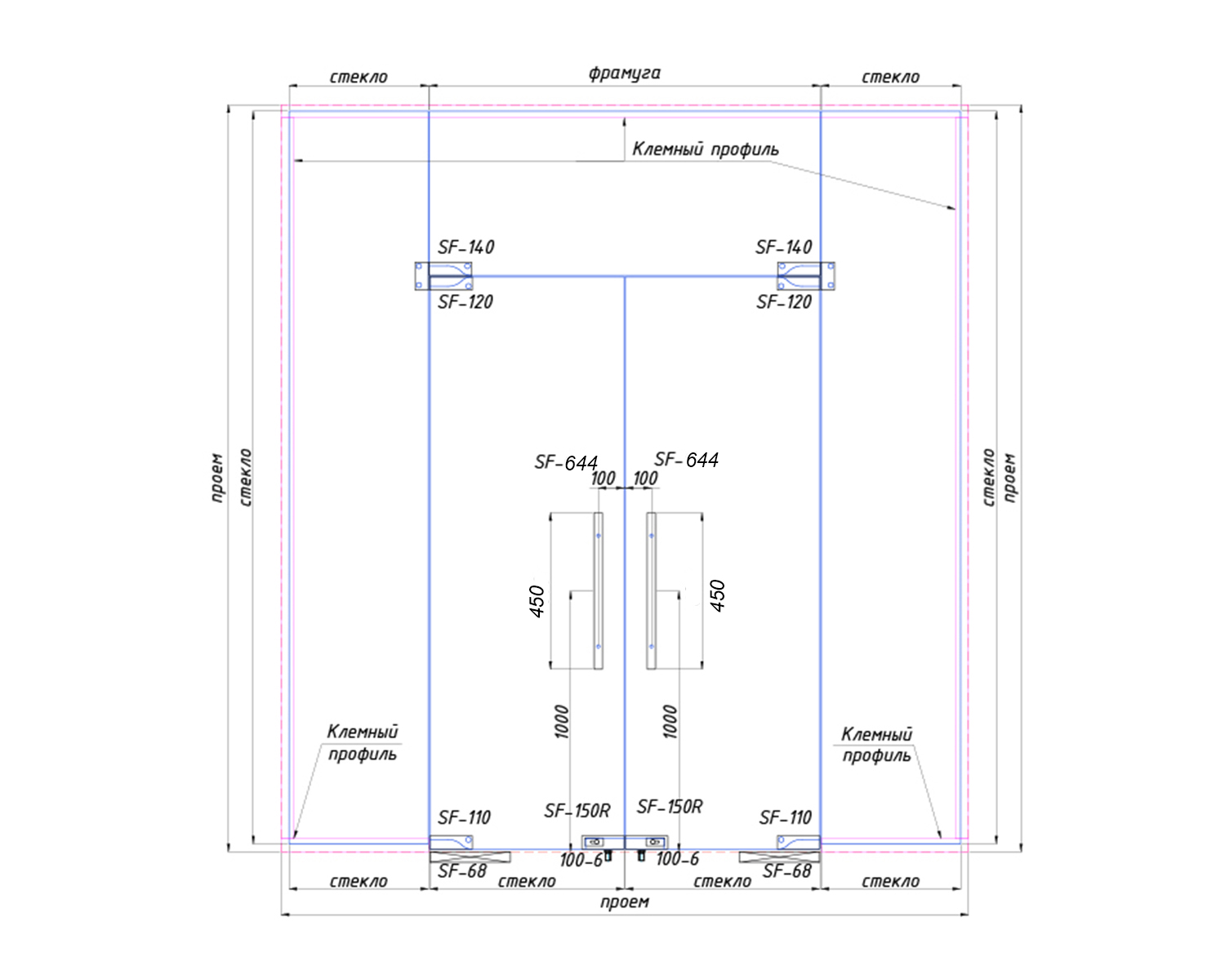 У двері передбачені підлогові дотягувач з фіксацією у відкритому та закритому положенні. Максимальна ширина одних дверей 1000 мм, висота 2700 мм.