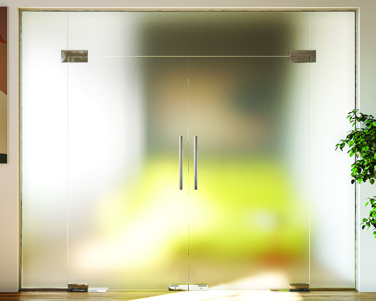 Комплект фурнітури для маятникових скляних дверей ідеально впишеться як в офіс або торговий центр, так й в місця, де потрібно максимально розширити можливість високої прохідності або мати широкий дверний блок.