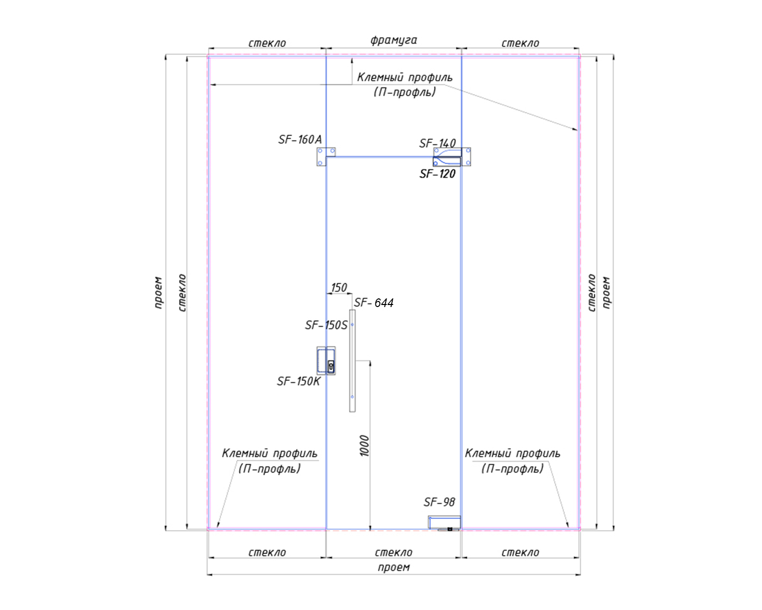 Однопрофільні двері в скляному отворі дозволять вам зробити скляну стіну ще й ефективною. По периметру всієї маятникової двері розташовані глухе скло, що не обмежує вас в розмірах самої перегородки, адже поставити двері можна в будь-якому потрібному для вас місці цієї перегородки.