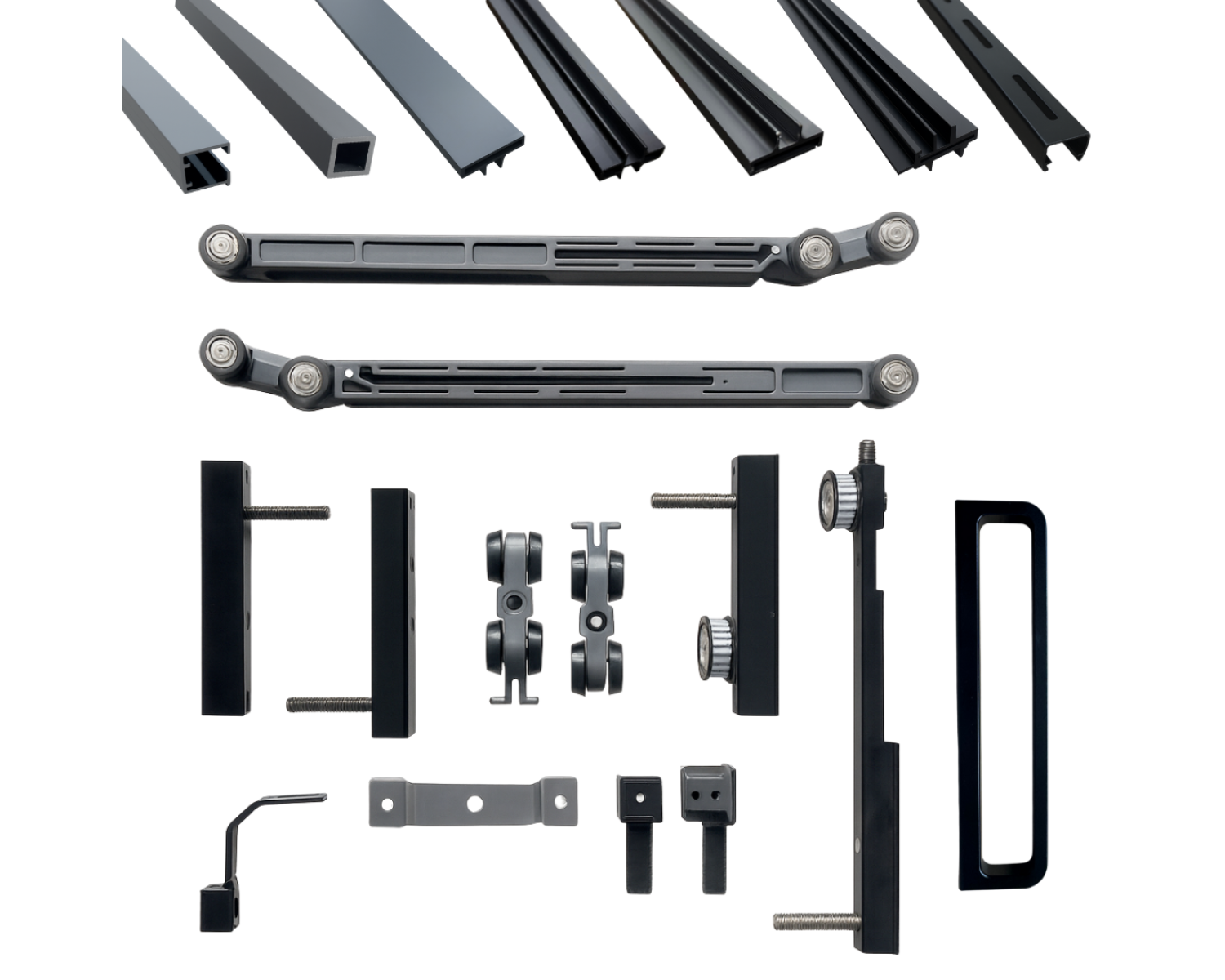 Основою системи є роликовий механізм, прихований у верхній напрямній. Він гарантує плавний та безшумний рух дверей, а також підвищує естетичність конструкції – усі технічні елементи залишаються непомітними. Верхня напрямна виготовлена з якісного алюмінієвого профілю, що забезпечує довговічність та стійкість до навантажень.