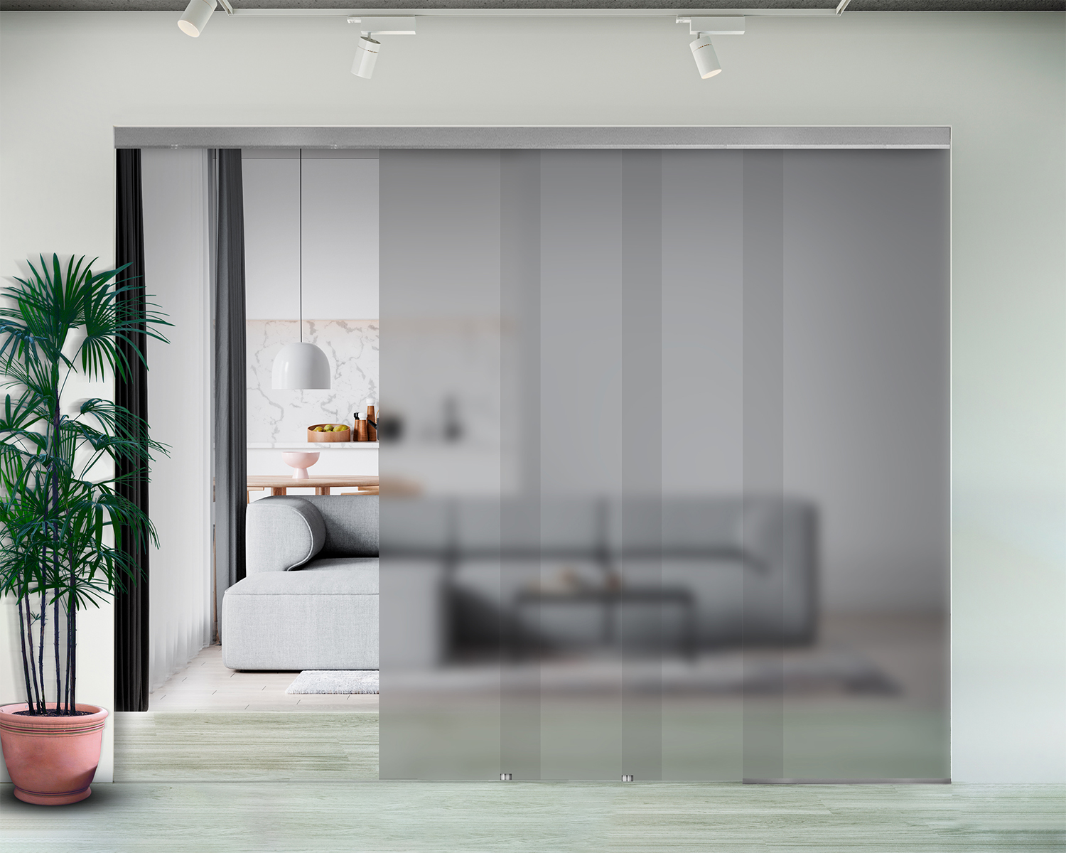 - Скляну розсувну конструкцію можна легко підвісити до стелі, стіни або склі, а також заховати рейок під навісну стелю..