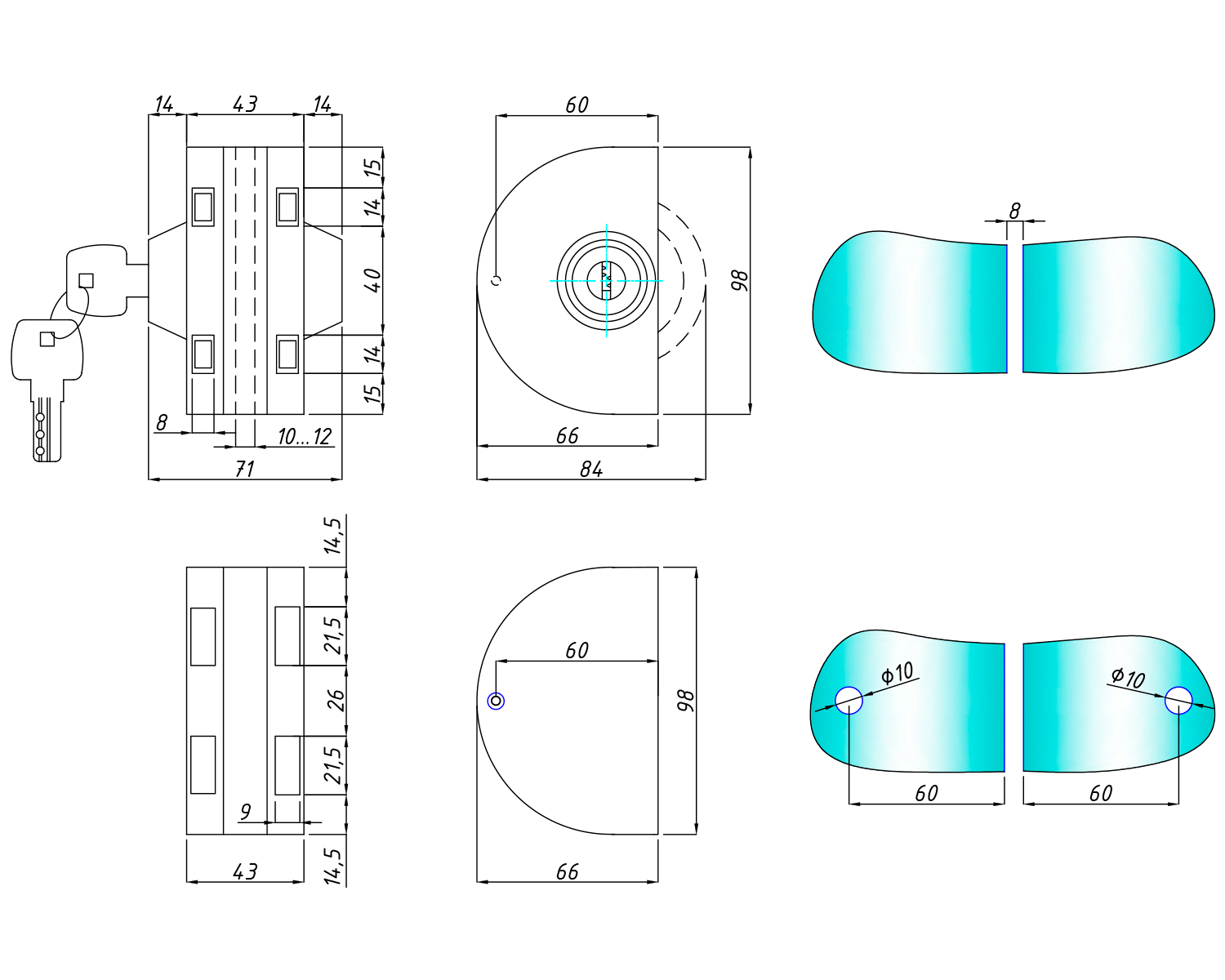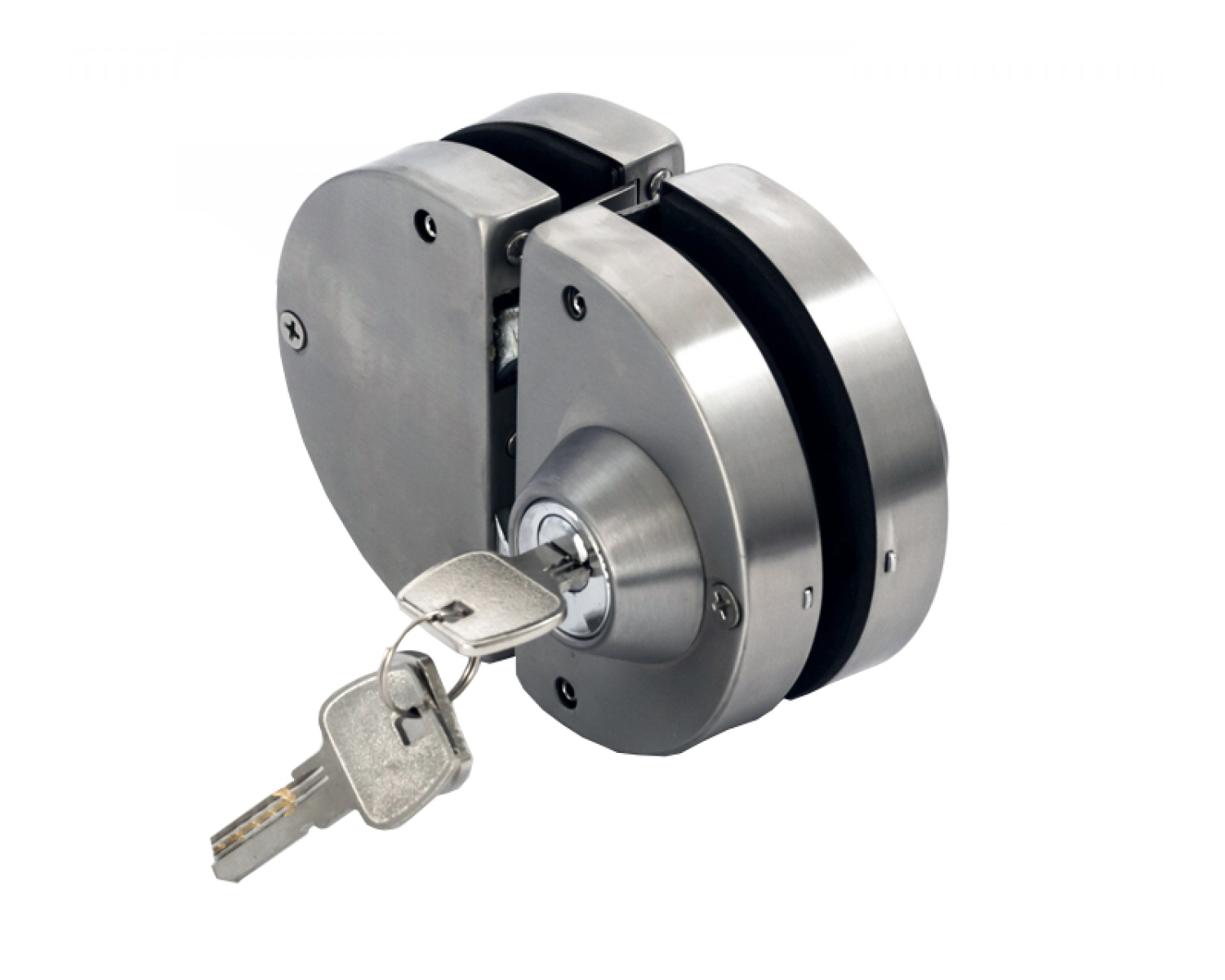 Замок для скляних маятникових конструкцій з товщиною скла від 10 до 12 мм, оснащений з однієї сторони комірчиком типу «Вороток», а з іншого — ключем.