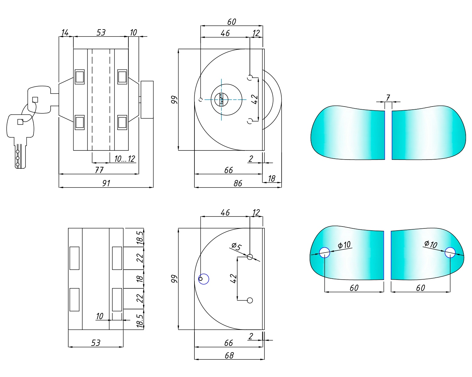 Замок для скляних маятникових конструкцій з товщиною скла від 8 до 12 мм, оснащений з однієї сторони комірчиком типу «Вороток», а з іншого — ключем.