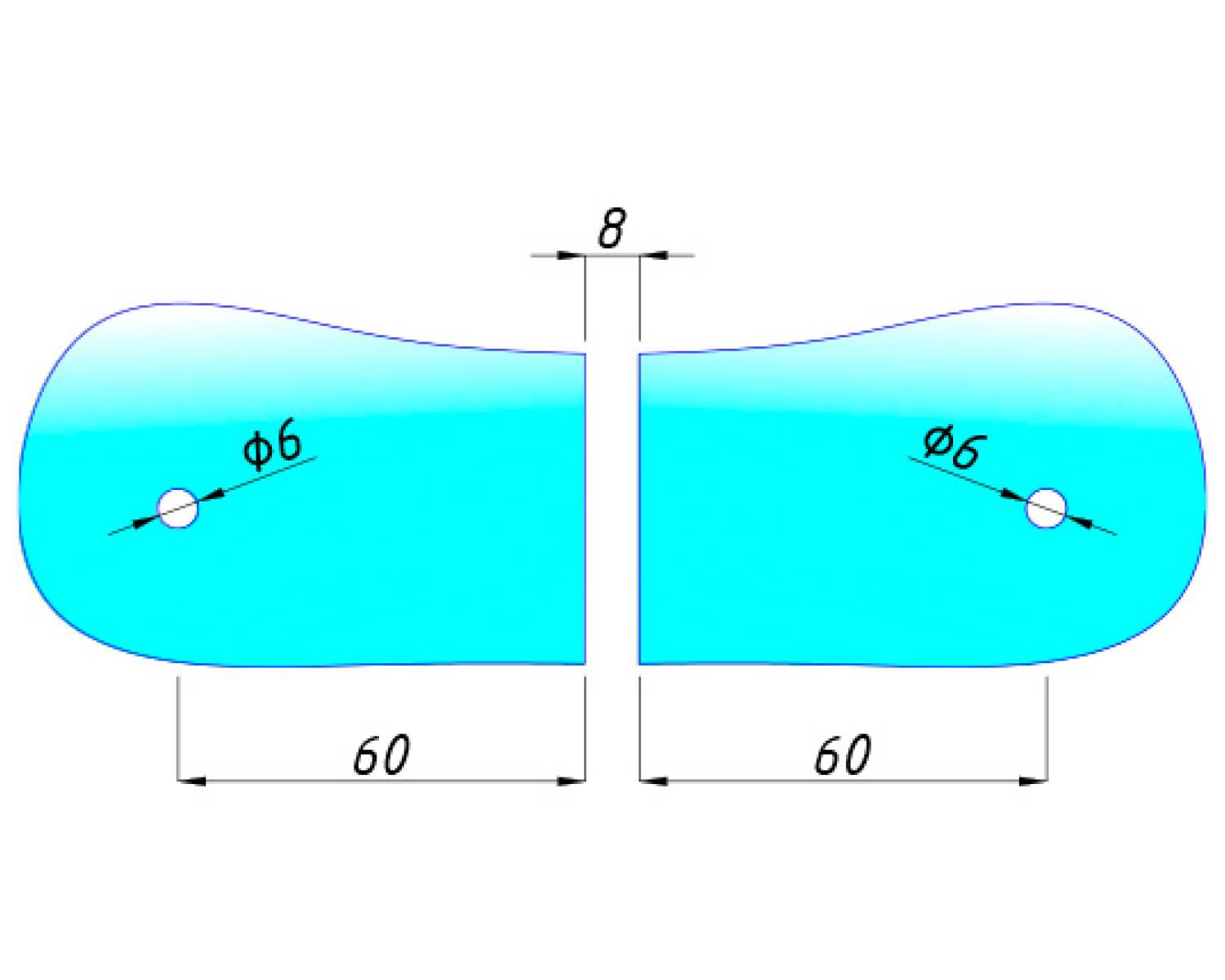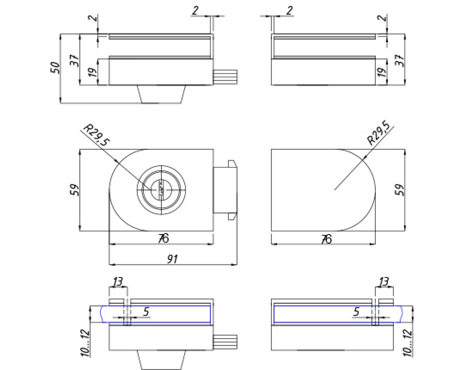 Замок для скляних маятникових конструкцій з товщиною скла від 10 до 12 мм, оснащений з однієї сторони комірчиком типу «Вороток», а з іншого — ключем.