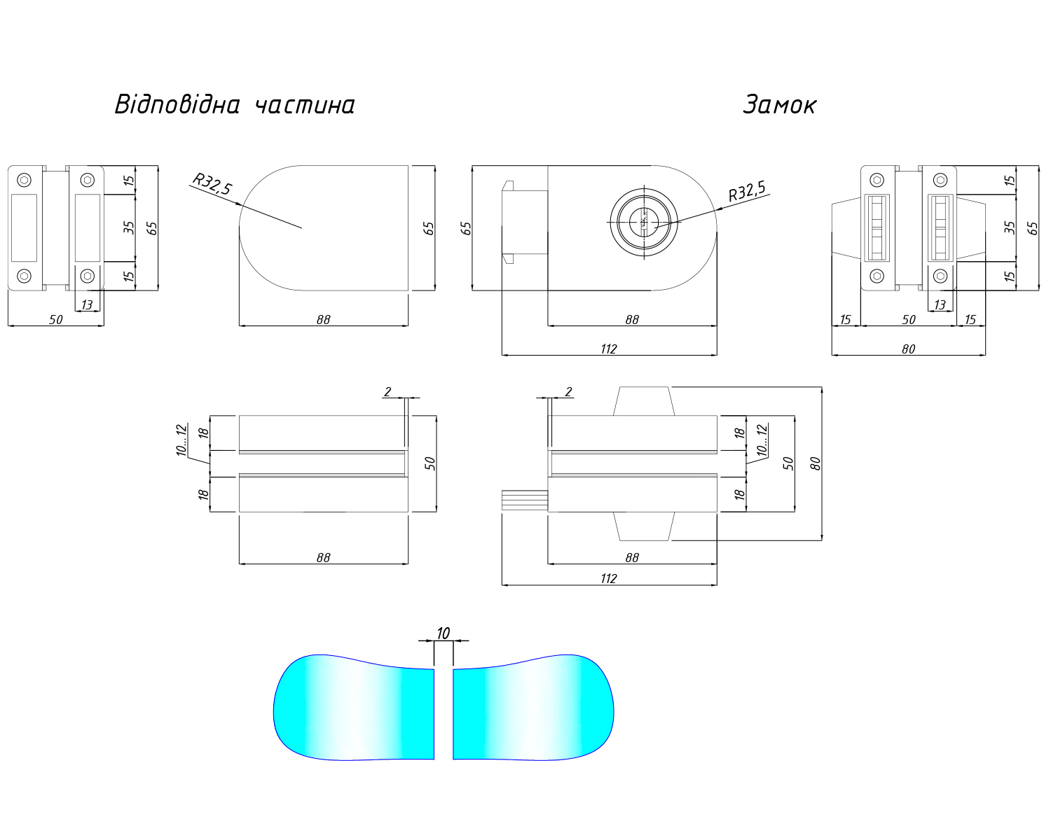 Замок для скляних маятникових конструкцій з товщиною скла від 10 до 12 мм.