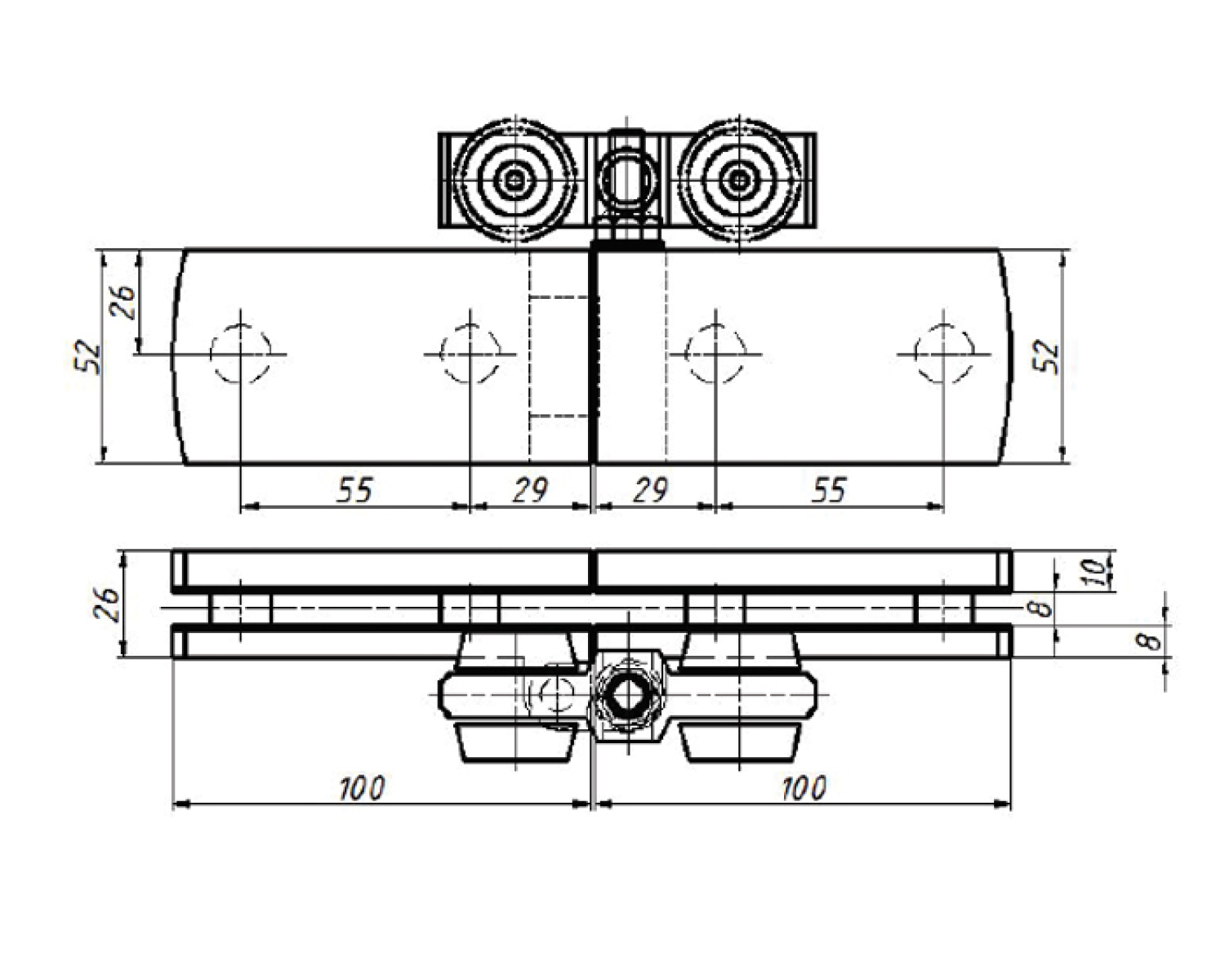 Власне на цю петлю для скляних конструкцій й доводиться вся вага розсувної системи, тому каретка посилена, а прогумовані ролики відмінно справляються з покладеної на них навантаженням.
