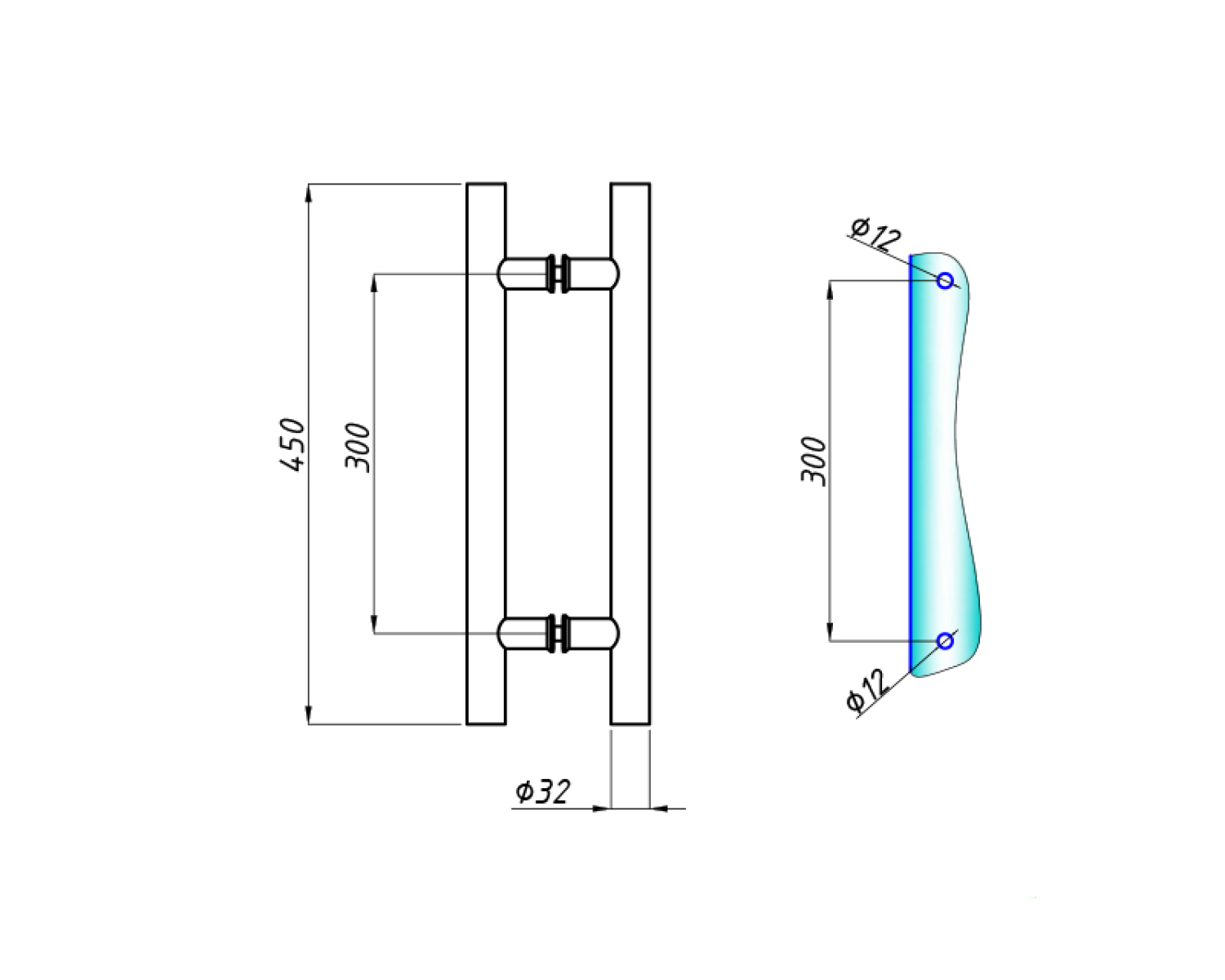 Довжина ручки 450 мм, міжвісьова відстань 300 мм, діаметр 32 мм.