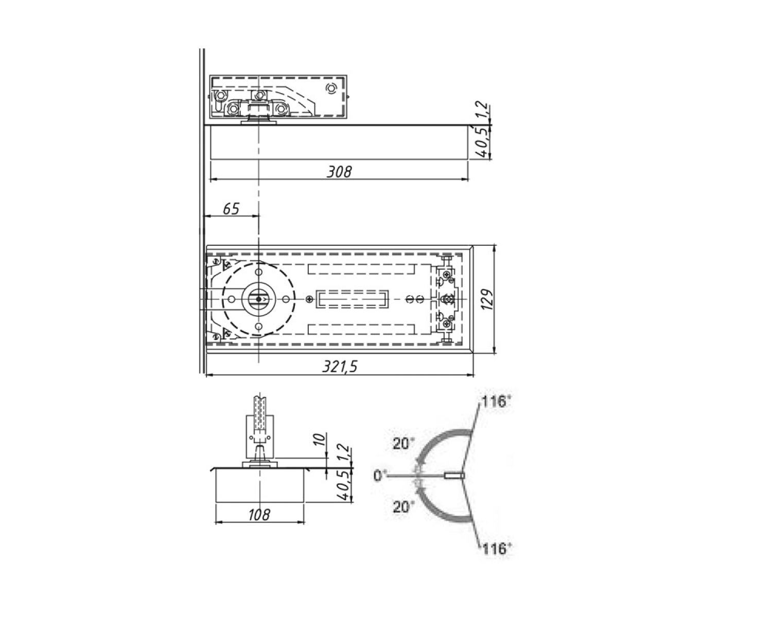 Дотягувач для скляних дверей має два регулювання швидкості закривання: від 90 до 20 та від 20 до 0 градусів. Максимальний кут відкривання 116 градусів.