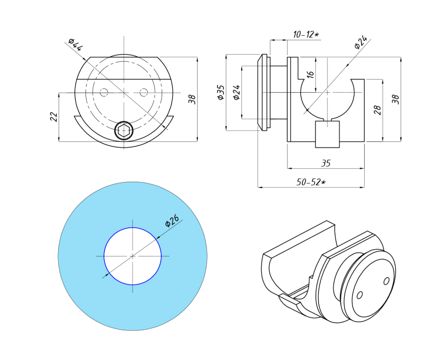 SF-825BZ Тримач трек-скло без зеньківки для розсувних скляних систем — це спеціалізований тримач для скляних розсувних систем, призначений для жорсткого з’єднання направляючого треку (труби Ø25 мм) із глухим, нерухомим склом. Застосовується в системах типу Manet для створення надійної опори та жорсткості конструкції.
