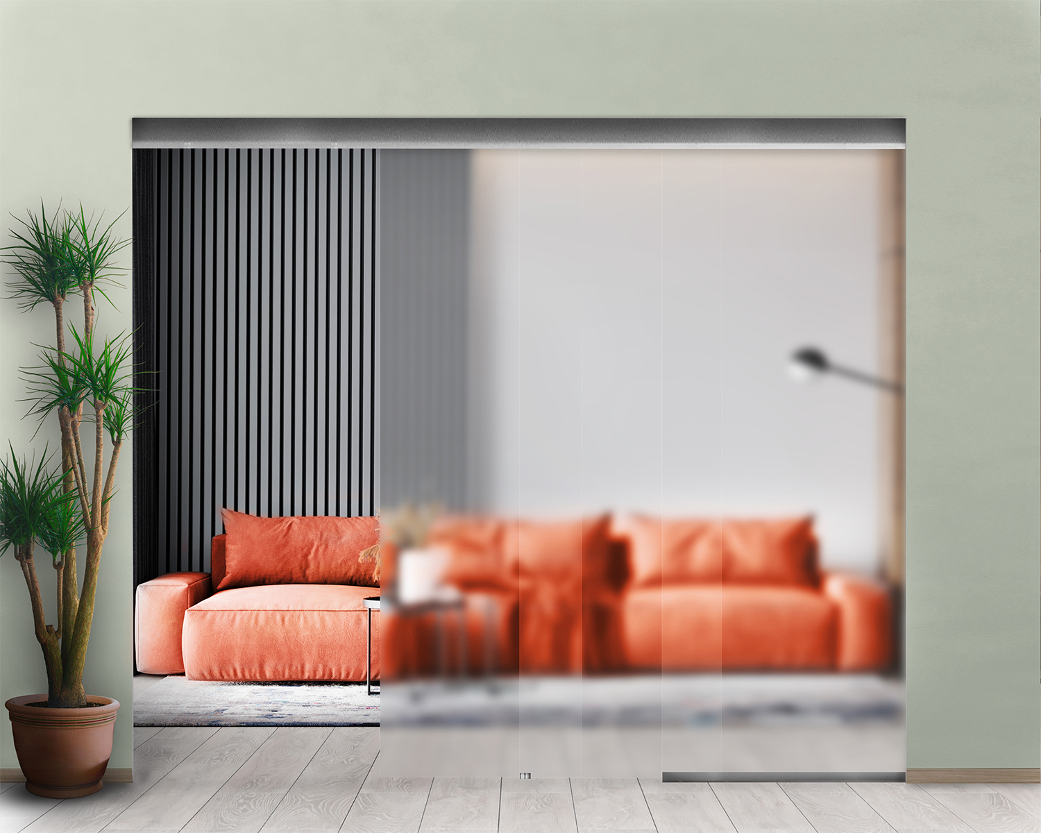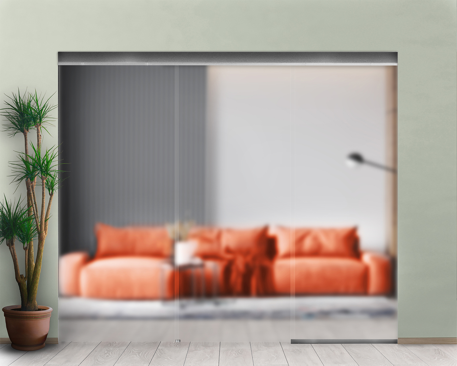 - Скляну розсувну конструкцію можна легко підвісити до стелі, стіни або склі, а також заховати рейки під навісну стелю.