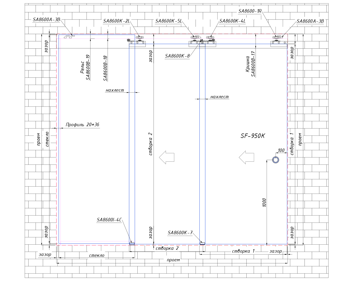 - SF-950К SSS Ручка-млинець 50 мм< — 1 шт. SF8600В-18 Профіль для нерухомої створки — 4 м.п.
