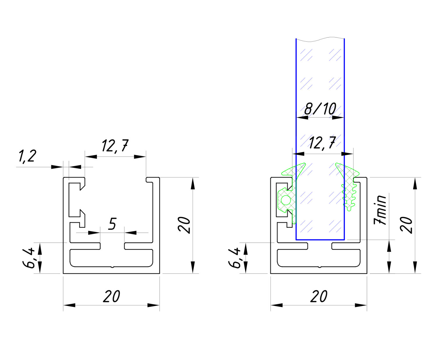 П-подібний профіль для маятникових систем з зовнішніми розмірами 20*20 мм для скла 8-10 мм.