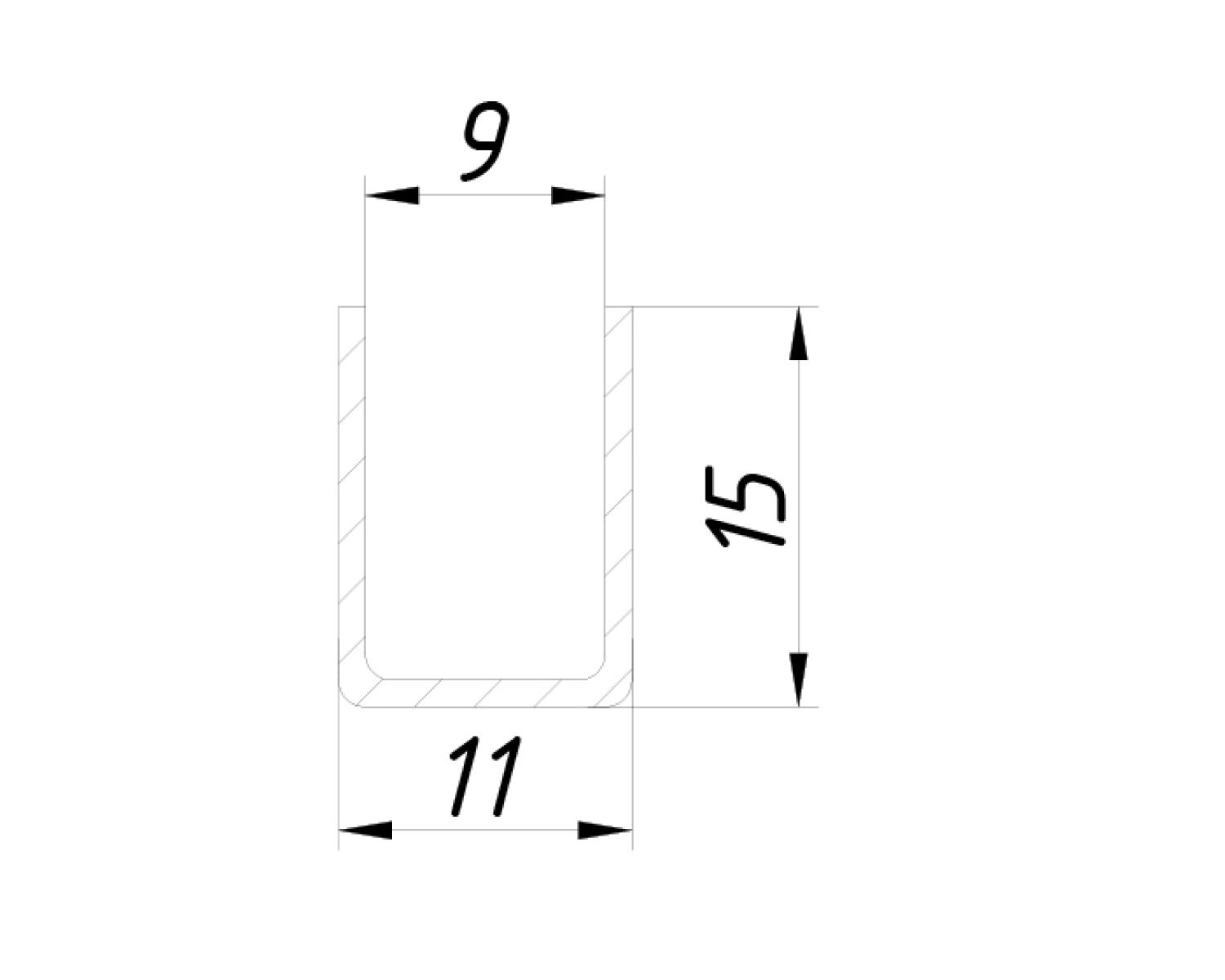 П-подібний профіль для маятникових систем з зовнішніми розмірами 15*11 мм для скла 8 мм. Даний швелер для скла використовується без ущільнювача.