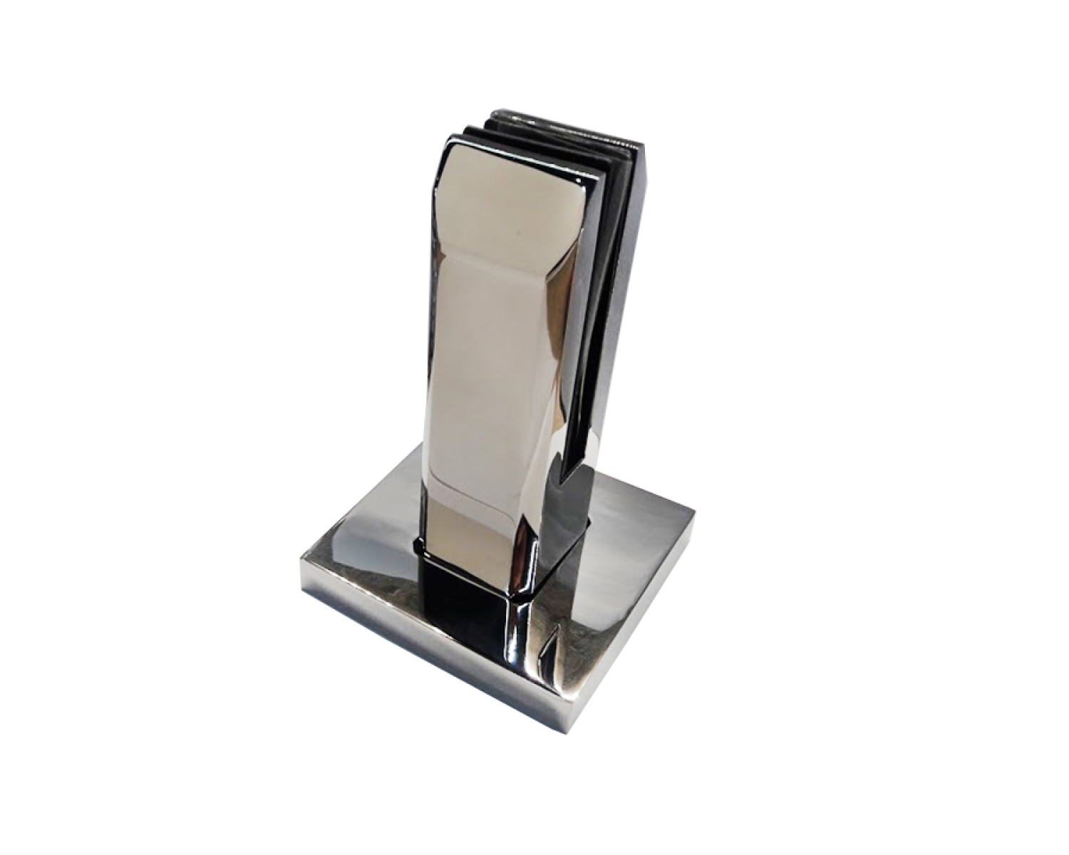 Розмір стійки становить 155 мм у висоту, з перерізом 50 × 44,5 мм. Внутрішній затискач розрахований на ширину скла до 12 мм, при цьому глибина посадки — приблизно 51 мм, що забезпечує стійкість в умовах інтенсивної експлуатації. Полірована поверхня чудово поєднується зі склом, не перевантажуючи конструкцію візуально.