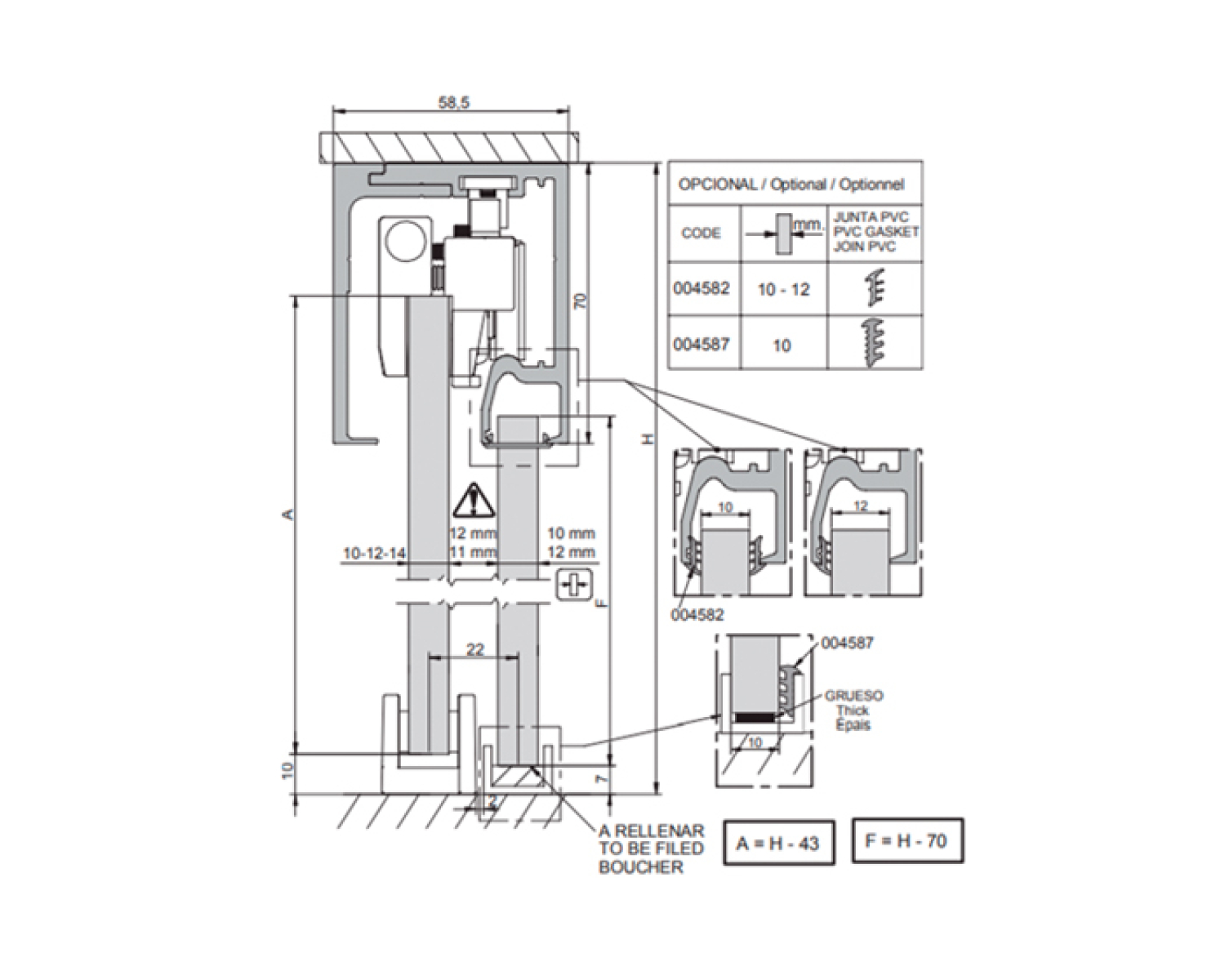 Направляючий рельс виконаний з товстостінного алюмінію та має розміри 70*58,5 мм. Такий розмір профілю обумовлений не тільки навантаженнями, з якими йому доведеться працювати, а й тим, що направляючий рельс повністю дозволяє заховати всі комплектуючі самої розсувної системи, ролики з затискачом та стопори.