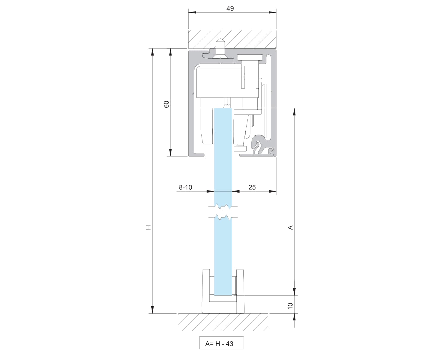 Направляюча рейка виконаний з товстостінного алюмінію та має розміри 60*49 мм. Такий розмір профілю обумовлений не тільки навантаженнями, з якими йому доведеться працювати, а й тим, що направляюча рейка повністю дозволяє заховати всі комплектуючі самої розсувної системи, ролики з затискачем та стопори.
